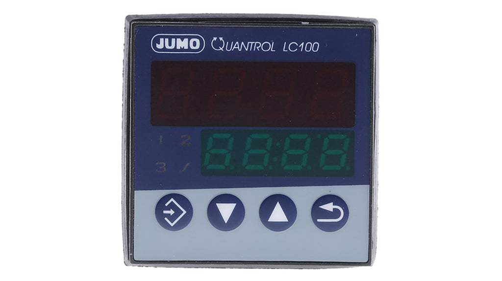 Controller di temperatura Jumo QUANTROL LC100, tensione di alimentazione 20-30 V c.a./c.c., dimensioni 48 x 48 mm, uscita analogica e relè, ingresso universale per sonde RTD e termocoppie, grado di protezione IP65, temperatura operativa da -5 a +55 gradi, ottimizzazione automatica PID, due display LED rosso/verde, interfaccia USB mini-B, modalità manuale/automatica, funzioni ON/OFF e PID. Codice costruttore 702031/8-3100-25.