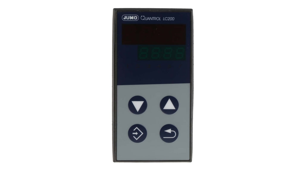 Controller di temperatura Jumo QUANTROL LC200, tensione di alimentazione 110-240 V ca, dimensioni 48 x 96 mm, uscita logica e relè, ingresso analogico universale per sonde RTD e termocoppie, grado di protezione IP65, temperatura operativa da -5 a +55 gradi, display LED rosso/verde, funzioni PID, modalità manuale/automatica, interfaccia RS485, ottimizzazione automatica, monitoraggio sensore. Codice costruttore 702032/8-2100-23.
