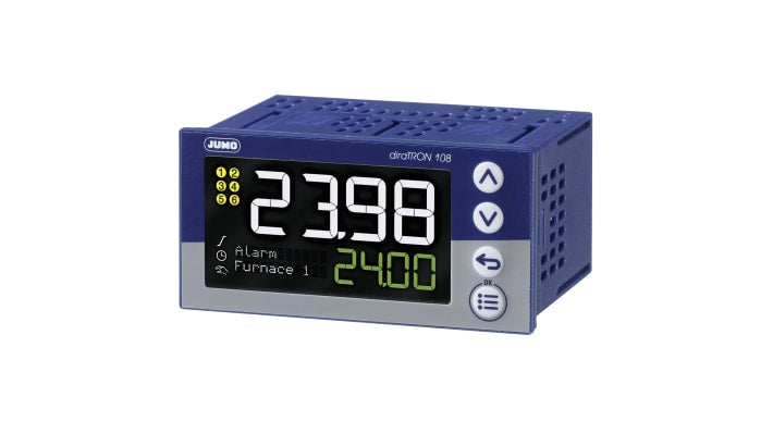 Termoregolatori PID Jumo diraTRON, tensione di alimentazione 110-240 V c.a., dimensioni 96 x 48 mm, 3 uscite (2 relè, 1 logico), 3 ingressi, gamma di temperatura -10 a +55 gradi Celsius, grado di protezione IP20/IP65, montaggio a pannello, display a segmento verde e bianco, regolazione automatica, funzione rampa, temporizzatore, monitoraggio valori limite, cablaggio rapido PUSH-IN, interfaccia RS485 opzionale.