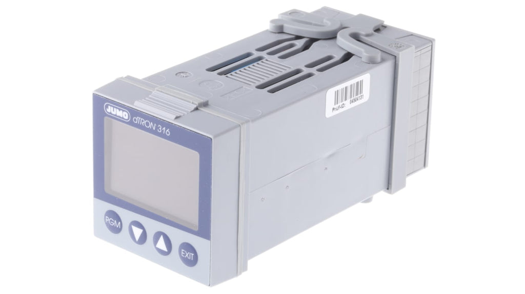 Termoregolatore PID Jumo dTRON, tensione di alimentazione 110-240 V ca, dimensioni 48 x 48 mm (1/16 DIN), 1 ingresso analogico, 4 uscite (logico, relè), grado di protezione IP20 e IP65, temperatura operativa da 0 a 55 gradi Celsius, display LED rosso/verde, interfaccia Profibus DP, configurazione tramite programma dedicato, 2 processi di ottimizzazione automatica, 4 set di punti di regolazione programmabili.