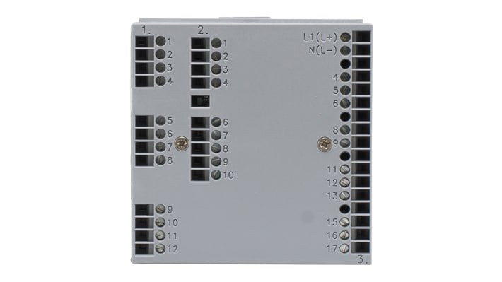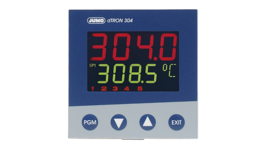 Termoregolatore Jumo serie dTRON, tensione di alimentazione 110-240 V ca, dimensioni 96 x 96 mm (1/4 DIN), 1 ingresso analogico, 4 uscite (logico, relè), grado di protezione IP20 e IP65, display LED rosso/verde, profondità pannello 105 mm, interfaccia RS422/485 e Profibus DP, temperatura operativa da 0 a 55 gradi Celsius, programmabile con 2 processi di ottimizzazione automatica, 4 set di punti di regolazione.
