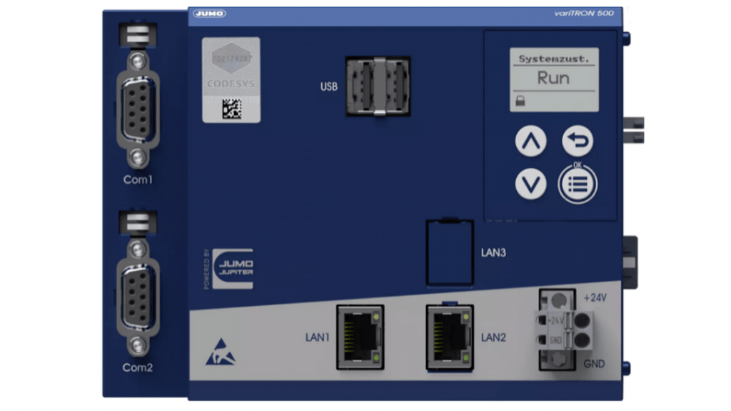 Computer industriale programmabile Jumo variTRON 500, CPU controller 800 MHz, 4 conduttori, grado di protezione IP20, alimentazione 24 V, assorbimento massimo 25 W, dimensioni 135 x 101 x 101,5 mm, interfacce di comunicazione OPC UA e MQTT, compatibile con CODESYS V3.5, piattaforma modulare JUMO JUPITER, flessibilità nel software e hardware.