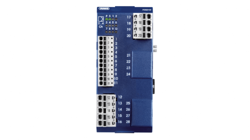 Modulo di monitoraggio Jumo per relè a stato solido, supporta fino a 4 canali controller PID, 2 ingressi analogici universali, 2 ingressi digitali, 2 uscite digitali, cablaggio rapido, morsettiere rimovibili, touchscreen multifunzione, PLC integrato opzionale, dimensioni 1,8 x 4 x 4 poll. Compatibile con variTRON, progettato per applicazioni industriali.
