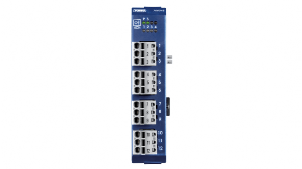 Modulo relè per variTRON, quattro uscite relè controllate da segnali digitali, contatti di commutazione 230 V / 3 A, configurazione automatica plug & play, collegamento anteriore delle uscite, morsettiere rimovibili per ogni canale, dimensioni 0,88 x 4,07 x 3,99 poll. Marchio Jumo, codice costruttore 705015/36/000.