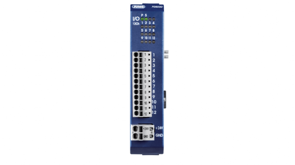 Modulo I/O digitale Jumo per variTRON, dotato di dodici canali configurabili come ingressi o uscite digitali, cablaggio rapido per tensione di esercizio e bus di sistema, morsettiere rimovibili con tecnologia Push-In, pannello multifunzione touchscreen, ingressi analogici universali, controller PID indipendente, PLC integrato opzionale, dimensioni 0,88 x 4,07 x 3,99 poll.