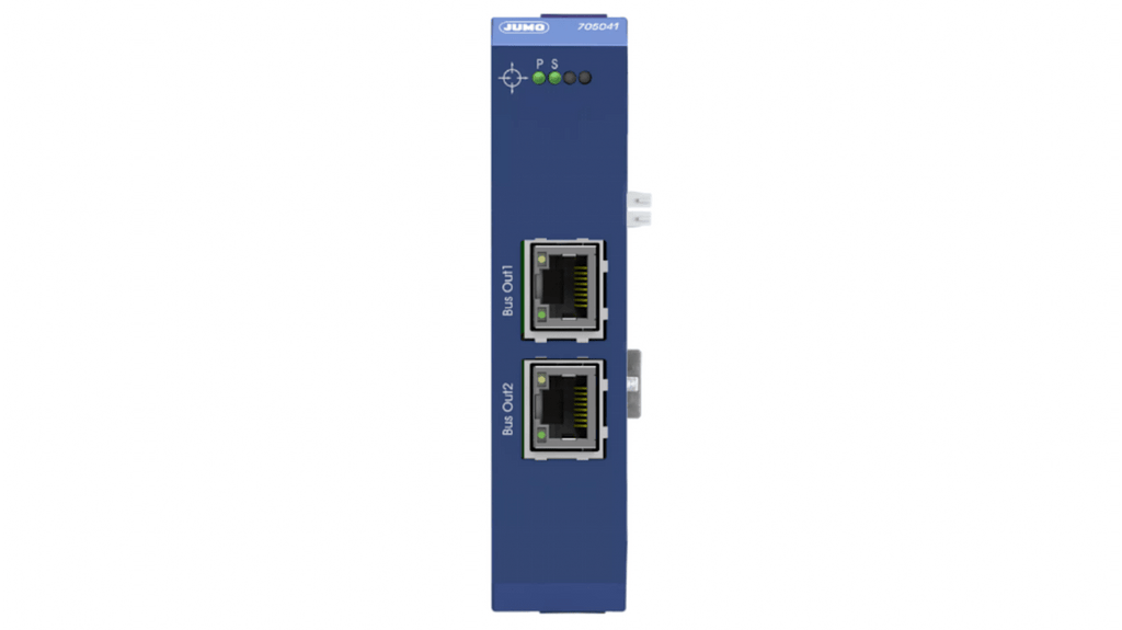 Modulo router a 2 porte per sistema di automazione JUMO variTRON, espansione con 2 uscite bus di sistema, compatibile con versioni a partire dalla 3, isolamento galvanico, cablaggio rapido, disposizione su guida DIN, connettori femmina RJ45, dimensioni 0,88 x 4,07 x 3,99 poll.