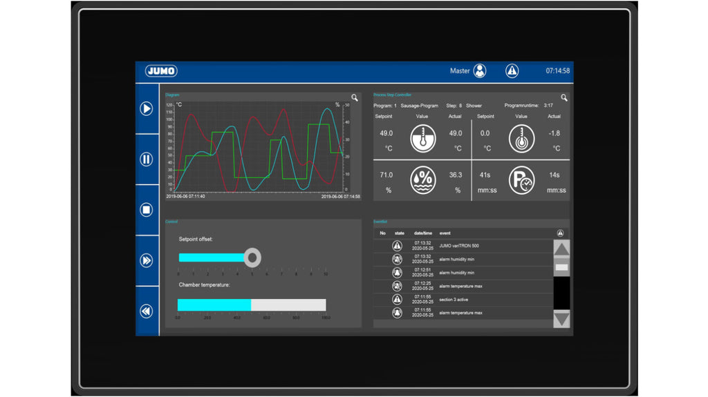 Pannello HMI Jumo, 7 poll., serie variTRON eX707, display TFT, risoluzione 800 x 480 pixels, retroilluminazione sì, grado di protezione IP66, interfaccia Ethernet e USB, alimentazione 10-32 V c.c., temperatura operativa da -20 a +60 gradi Celsius, dimensioni 187 x 147 x 47 mm, montaggio a pannello, touchscreen capacitivo, omologazione UL e DNV GL.