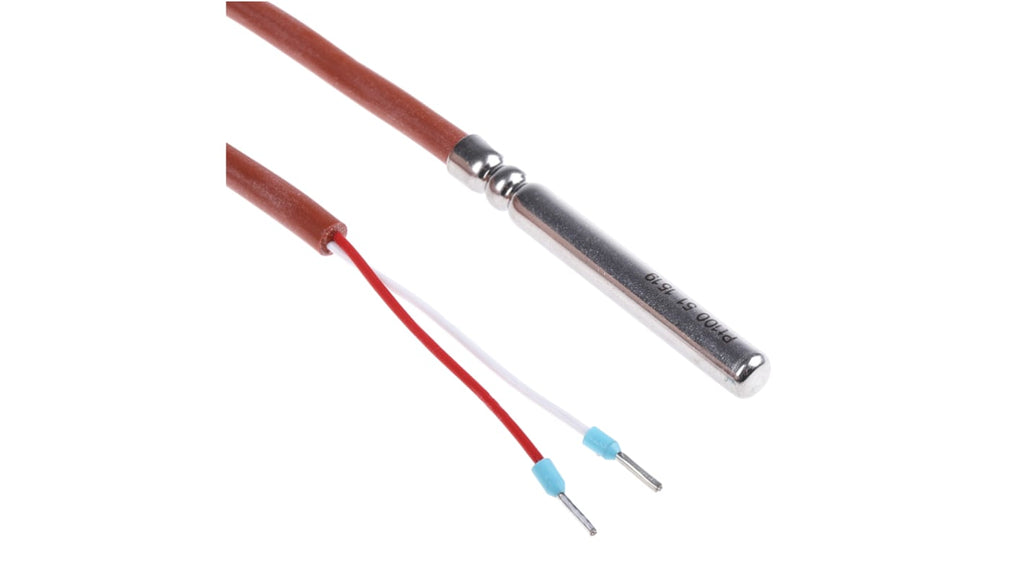 Sensore di temperatura RTD a innesto, PT100, lunghezza sonda 50mm, diametro sonda 6mm, temperatura minima -50°C, temperatura massima +180°C, cavo di collegamento 2.5m, materiale sonda acciaio inossidabile, collegamento a 2 fili, precisione classe B, tempo di risposta 10 s in acqua, 98 s in aria. Adatto per misurazione in liquidi e gas, conforme a DIN EN 60751.