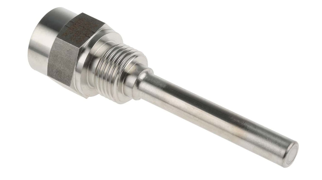 Thermowell Jumo per uso con termocoppia, custodie protettive in acciaio INOX 316L, diametro sonda 6-8 mm, diametro esterno 10 mm, collegamento gas femmina 1/2 BSP, temperatura minima -50 gradi Celsius, temperatura massima +200 gradi Celsius, progettato per la sostituzione di sonde senza drenare il circuito. Codice costruttore 909710/10-848-10-100-104-26/000.