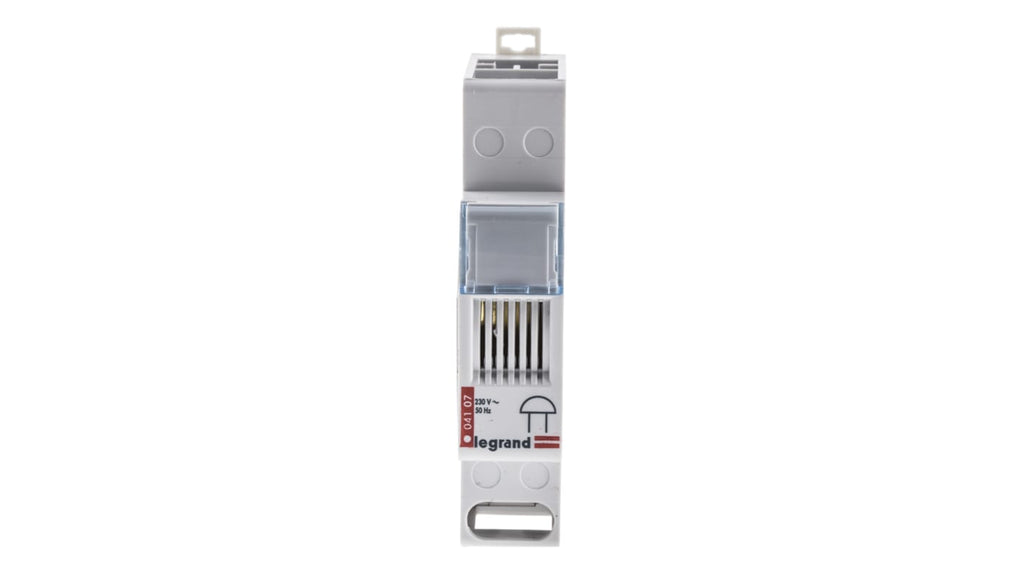 Cicalino per segnalazione acustica, tensione di alimentazione 230 V c.a., emissione sonora 75 dB a 1 metro, montaggio a pannello, connessioni a vite dei morsetti, applicazione in sistemi di controllo di processo, compatibile con guida DIN 50022. Decibel massimi 83 dB. Marchio Legrand, codice costruttore 0 041 07.