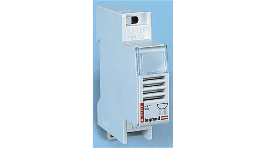 Cicalino per montaggio su guida DIN, tensione di alimentazione 24 V c.a., segnalatore acustico con emissione di 75 dB a 1 metro, collegamento diretto alla rete elettrica, applicazione per sistemi di controllo di processo, connessioni a vite dei morsetti, numero di toni 1. Marchio Legrand, codice costruttore 0 041 11.