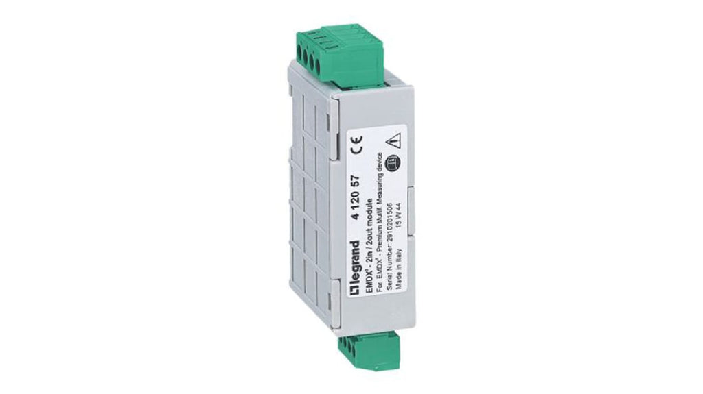 Modulo di espansione PLC per Unità di misurazione multifunzione. Serie EMDX3, compatibile con modello 412053. Tipo di ingresso digitale, 2 ingressi, 2 uscite relè. Montaggio a pannello, dimensioni 45,4 x 21 x 78,2 mm. Applicazione industriale, comunicazione RS485 disponibile. Codice costruttore 4 120 57, marchio Legrand.
