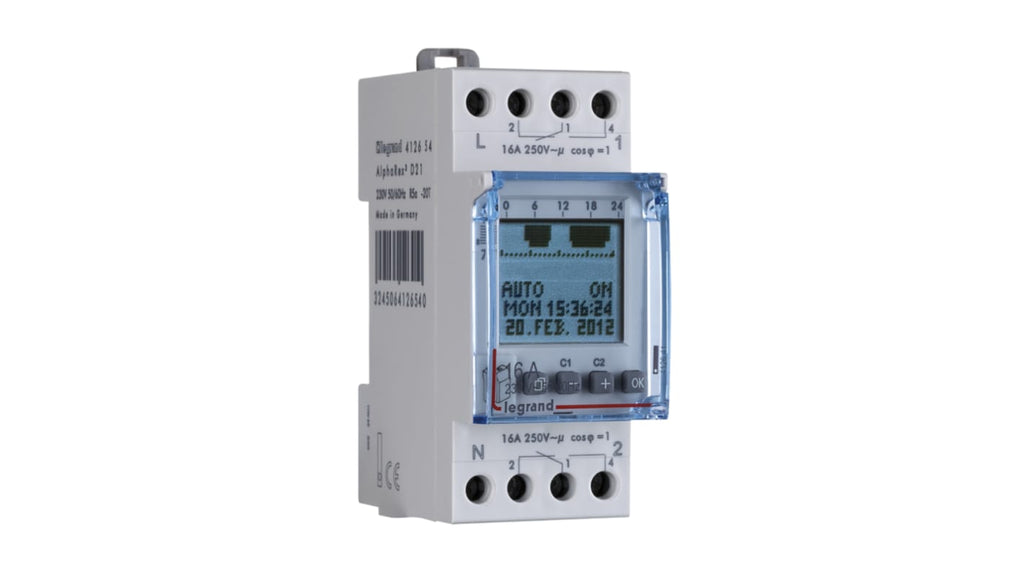 Temporizzatore per guida DIN, 230 V ca, 1 canale, programmabile in ore, minuti, secondi. Interruttore orario digitale AlphaRex Astro Legrand, display grafico retroilluminato, montaggio su guida DIN, programmazione 24 ore/7 giorni, memoria EEPROM, correzione orario estate/inverno automatica, protezione IP20. Dimensioni: 83 mm x 66 mm, durata della batteria 5 anni. Codice costruttore: 4 126 54.