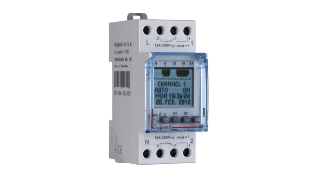 Temporizzatore digitale per guida DIN, tensione di alimentazione 230 V ca, 2 canali, programmazione ore, minuti, secondi. Display grafico retroilluminato, montaggio su guida DIN, programmazione 24 ore/7 giorni, memoria EEPROM, correzione orario estate/inverno automatica, protezione IP20. Dimensioni 83 mm x 66 mm, durata della batteria 5 anni. Codice costruttore 4 126 57, marchio Legrand.