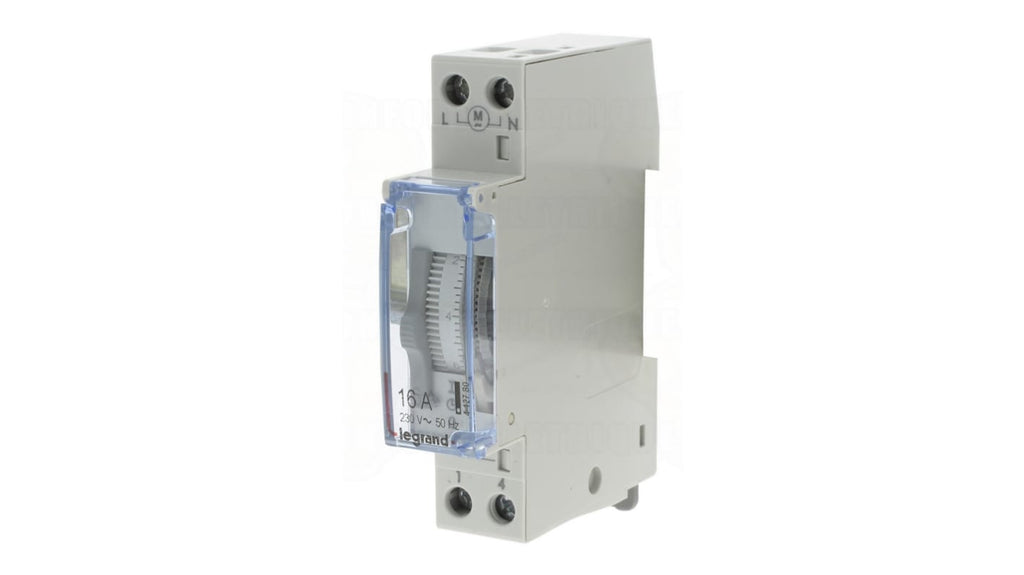 Temporizzatore per guida DIN, unipolare normalmente aperto, tensione di alimentazione 230 V ca, tipo analogico, programmabile in ore, minuti e secondi. Montaggio su guida DIN, configurazione contatto unipolare, lunghezza segmento 15 minuti. Dimensioni: altezza 83 mm, profondità 66 mm. Prodotto Legrand, codice costruttore 4 127 80.
