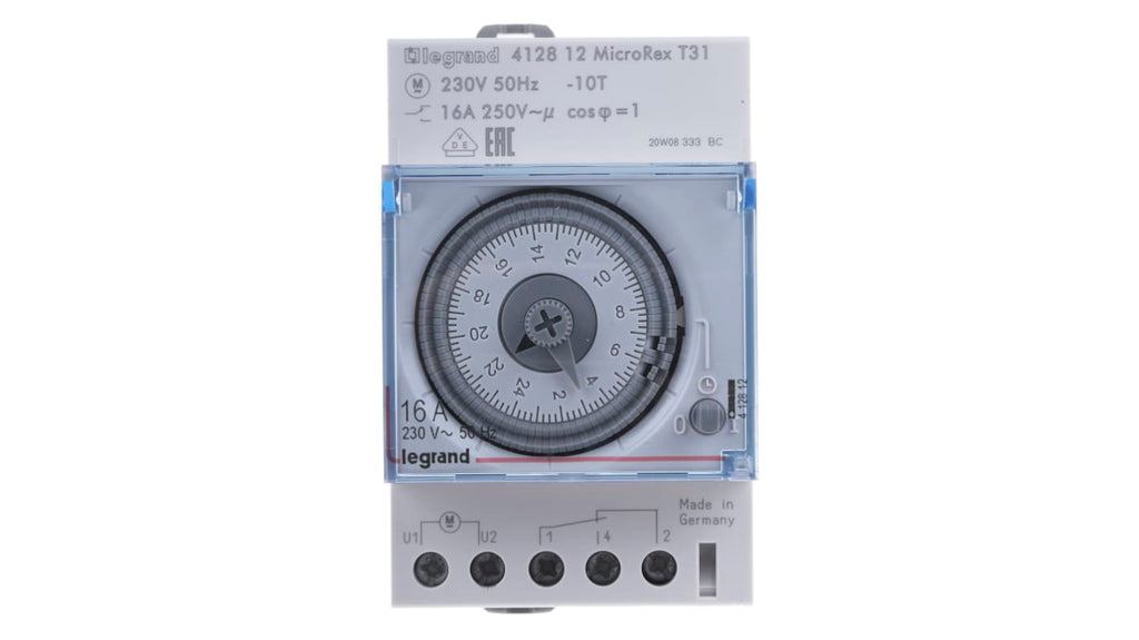 Temporizzatore per guida DIN Legrand, SPDT, 230 V ca, 3 canali, programmabile in ore, minuti, secondi. Tipo analogico, montaggio su guida DIN, tempo di commutazione minimo 15 minuti, dimensioni 83 mm x 66 mm. Riserva di funzionamento 100 ore, configurazione contatto SPDT. Progettato per applicazioni industriali e commerciali.
