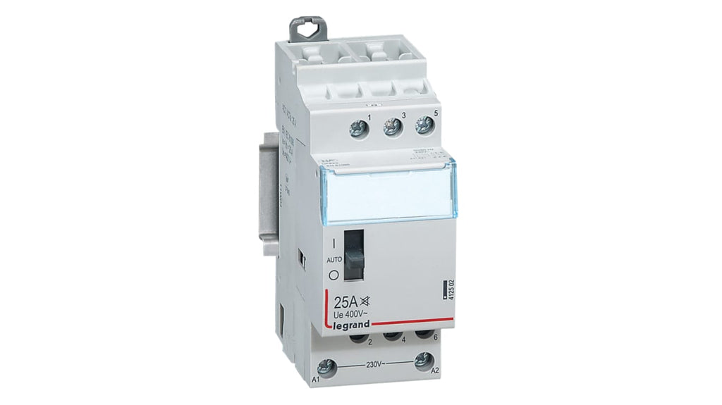 Contattore Legrand, 3 poli, 3NO, 25 A, 3 kW, bobina 230 V, classe di protezione IP2X, compatibile con ausiliari per contattori CX 3, identificazione silenziatore circuiti con portaetichette. Utilizzato per erogare carico in tariffazione off-peak.