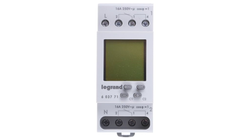 Temporizzatore per guida DIN Legrand, SPDT, 230 V ca, 2 canali, programmabile con display digitale, 14 programmi per canale, esclusione manuale ON/OFF, riserva di funzionamento di 3 anni, batteria sostituibile, gamma di temperatura da -10 a 55 gradi, grado di protezione IP20, conforme a EN 60730-1 e EN 60730-2-7. Montaggio su guida DIN.