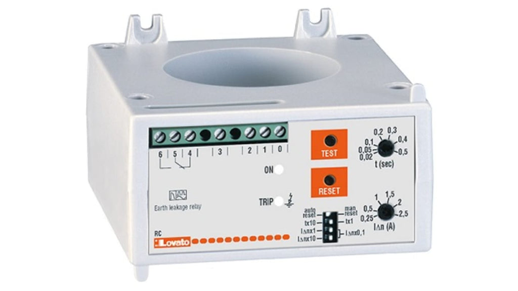 Relè di dispersione verso terra Lovato, 50 Hz, 60 Hz, 0.25 a 2.5A, contenitore compatto per montaggio a pannello 96 x 96 mm, grado di protezione IP20, reset automatico o manuale, LED di alimentazione verde, LED di scatto rosso, pulsanti TEST e RESET, temperatura d'esercizio -10 a 60 gradi Celsius, tensione di resistenza 2.5 kV per 60 s, consumo massimo 3 VA, uscita SPDT.