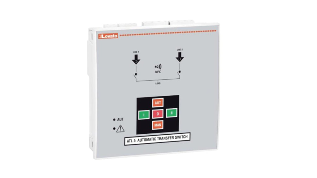 Controller interruttore di trasferimento automatico Lovato ATL500, 2 ingressi digitali programmabili, 3 uscite relè programmabili, alimentazione 110-230 V c.a., potenziometri per impostazione manuale dei ritardi, interfaccia di programmazione NFC, progettato per la commutazione automatica o manuale tra linea principale e linea di emergenza.
