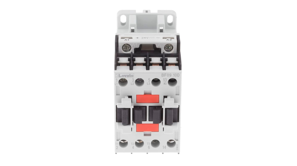 Contattore Lovato, serie BF, 3 poli, 3 NA, 9 A, 4 kW, bobina 24 V c.c., tensione nominale contatto 440 V c.a., corrente nominale contatto 9 A, potenza nominale 4 kW, montaggio su guida DIN 35 mm, grado di protezione IP20, temperatura operativa da -50 a +70 gradi, dimensioni 81 mm x 45 mm x 80.7 mm, tipo terminale a vite.