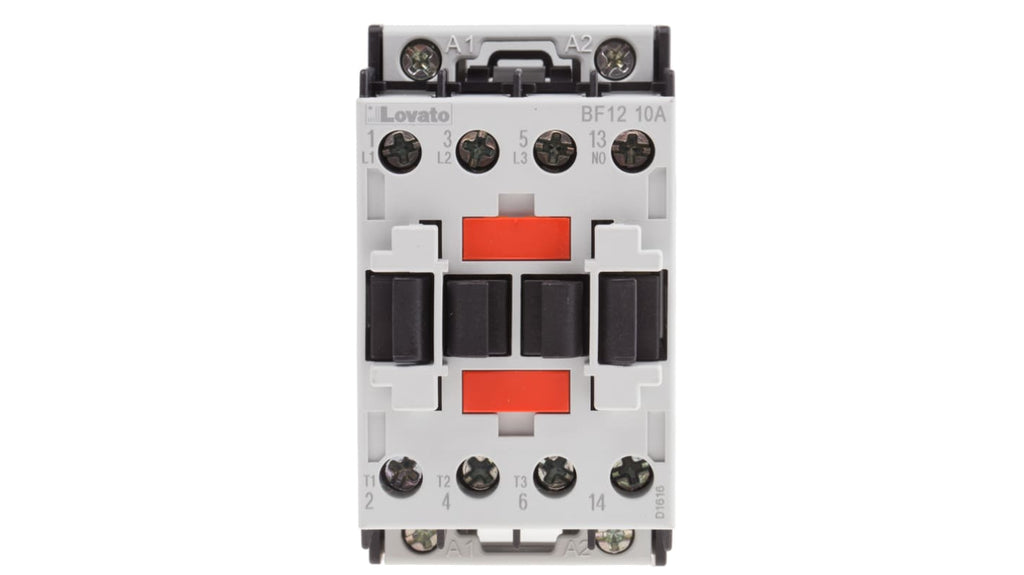Contattore Lovato, serie BF, 3 poli, 3 NA, corrente nominale 12 A, potenza 5,5 kW, tensione bobina 230 V c.a., tensione nominale contatto 440 V c.a., tipo terminale a vite, montaggio su guida DIN da 35 mm, grado di protezione IP20, temperatura operativa da -50°C a +70°C, dimensioni 81 mm x 45 mm x 80,7 mm.