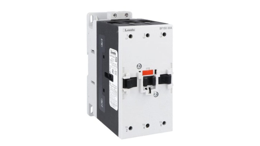 Contattore tripolare Lovato, serie BF15, progettato per applicazioni fotovoltaiche, tensione bobina 120 V, 3 poli, corrente nominale 150 A, potenza nominale 55 kW, tensione nominale contatto 1 kV, circuito di controllo con fusibile di protezione, protezione contro i cortocircuiti, conforme a CSA e UL.