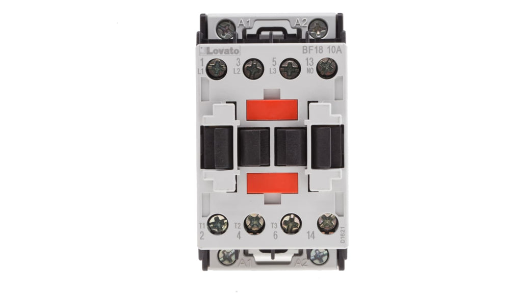 Contattore Lovato, serie BF, 3 poli, 3 NA, 18 A, 7,5 kW, bobina 24 V c.a. Tensione nominale contatto 440 V c.a., corrente di ingresso 32 A, dimensioni 81 mm x 45 mm x 80,7 mm, tipo terminale a vite, 1 contatto ausiliario 1 NA, temperatura operativa -50 °C a +70 °C, grado di protezione IP20, montaggio su guida DIN da 35 mm.