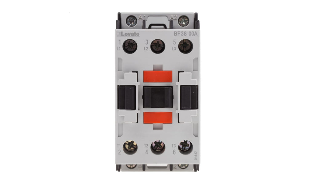 Contattore Lovato, serie BF, 3 poli, 3 NA, 38 A, 18,5 kW, bobina 24 V c.a., tensione nominale contatto 440 V c.a., montaggio su guida DIN 35 mm, protezione IP20, contatti ausiliari altamente conduttivi, dimensioni 45 mm x 90 mm x 90 mm, temperatura operativa da -50°C a +70°C, tipo terminale a vite.