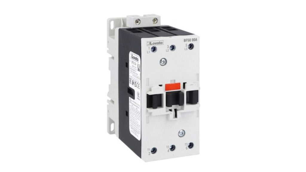 Contattore tripolare Lovato, serie BF50, tensione bobina 220 V c.a., numero poli 3, tensione nominale contatto 690 V, corrente nominale contatto 50 A, potenza nominale 30 kW, compatibile con EMC, contatti a specchio, progettato per applicazioni multiple, lunga durata meccanica ed elettrica. Codice costruttore BF5000A22060.