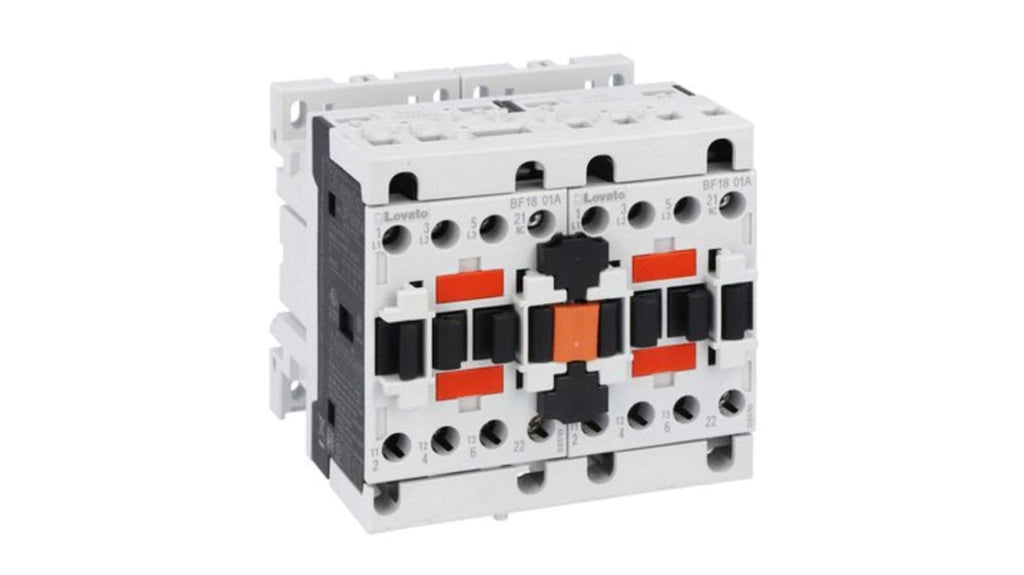 Teleinvertore Lovato, serie BFA018, 3 poli, 1NC, 18 A, 7,5 kW, bobina 400 V c.a., interblocco esterno con cablaggio di alimentazione e ausiliario, contatto ausiliario normalmente chiuso, tensione nominale contatto 690 V, certificazione cULus.