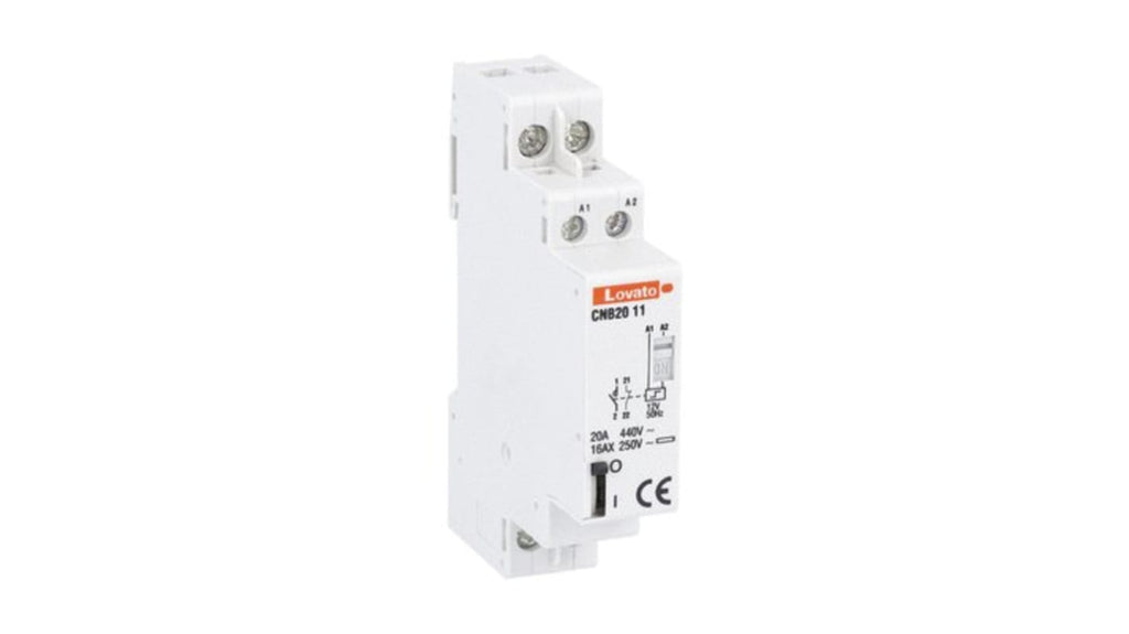 Relè bistabile Lovato, SPDT, bobina 12V, montaggio su guida DIN, corrente di commutazione 20A, 2 poli, durata meccanica 3000000 cicli, durata elettrica AC3 300000 cicli, durata elettrica AC1 200000 cicli, grado di inquinamento 3, classe di protezione IP20, certificazione EAC. Codice costruttore CNB2011012.