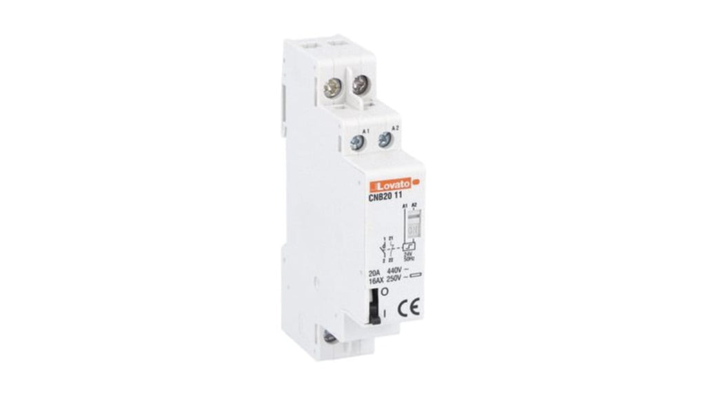 Relè bistabile Lovato, SPDT, bobina 24V, montaggio su guida DIN, corrente di commutazione 20A, durata meccanica 3000000 cicli, durata elettrica AC3 300000 cicli, durata elettrica AC1 200000 cicli, grado di inquinamento 3, classe di protezione IP20, certificazione EAC. Codice costruttore CNB2011024.
