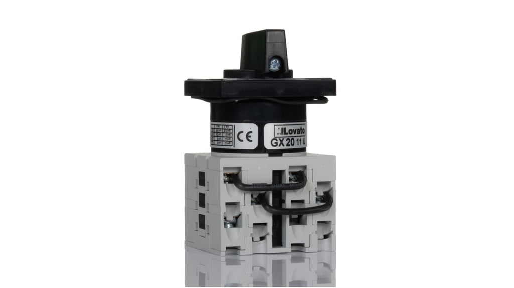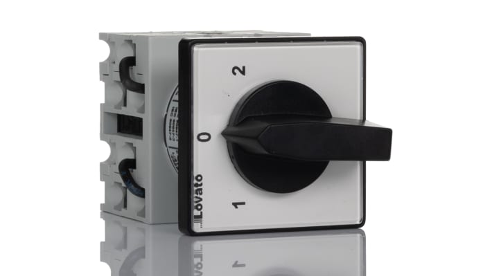 Interruttore a camma Lovato, configurazione 3PDT, 3 posizioni, corrente massima 20A, tipo terminale a vite, dimensioni 48 x 48 x 87,5 mm, attuatore a maniglia, montaggio frontale, angolo di corsa 60 gradi, contatti in lega d'argento a doppia interruzione, adatto per applicazioni monofase e trifase, progettato per isolamento e commutazione di carichi elettromagnetici.