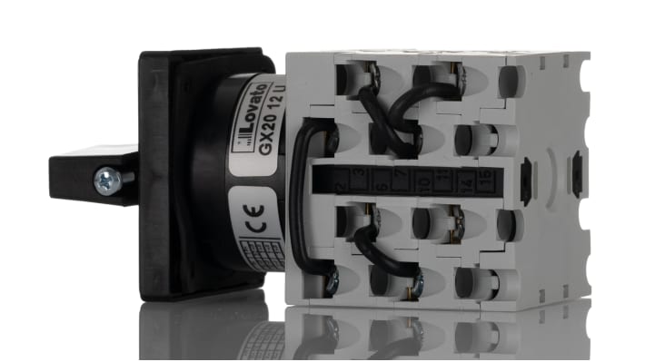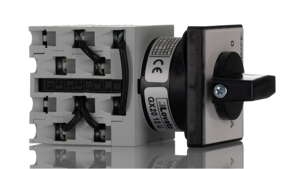 Interruttore a camma Lovato serie GX, modello GX2012U, 4 poli, 3 posizioni, corrente massima 20A, tensione massima 690V ca, configurazione 4PDT, attuatore a maniglia, montaggio frontale, dimensioni 48 x 48 x 96 mm, terminali a vite, angolo di corsa 60 gradi. Adatto per applicazioni monofase e trifase, ideale per il controllo di motori e avviatori stella-triangolo.