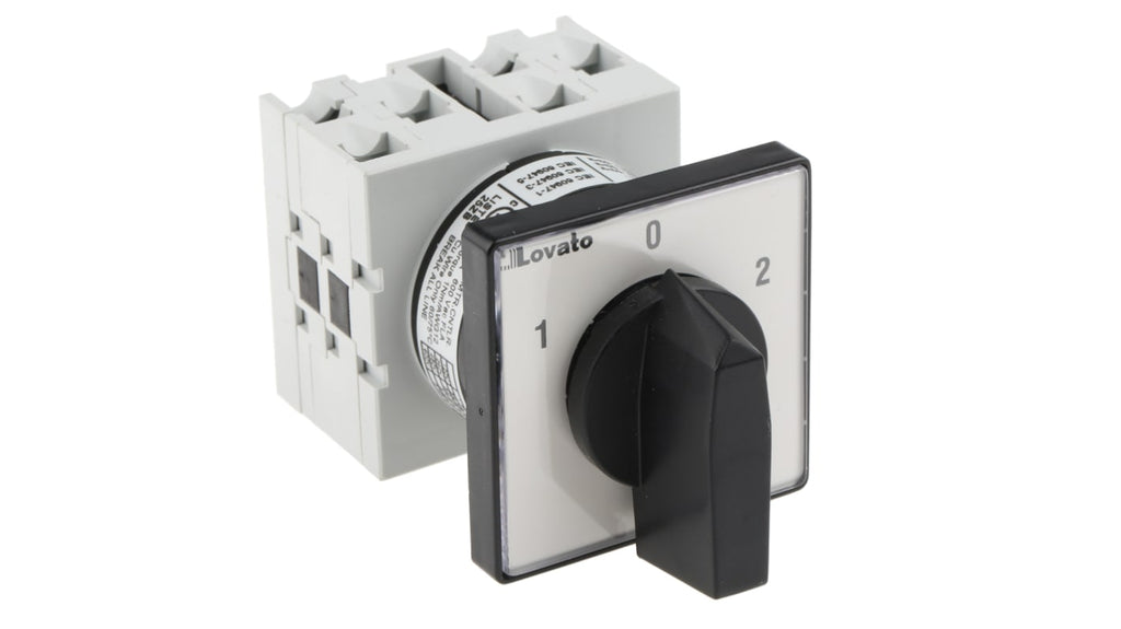 Interruttore a camma Lovato, serie GX, configurazione DPDT, 3 posizioni, corrente massima 20A, tensione massima 690V ca, contatti in lega d'argento a doppia interruzione, terminali a vite, attuatore a manopola, dimensioni 48 x 48 x 79mm, montaggio frontale, angolo di corsa 60°, supporto per fasi elettriche monofase e trifase.