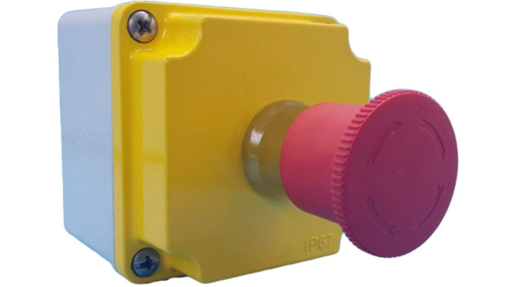 Pulsante di arresto di emergenza montaggio superficiale, Lovato LPZM, configurazione contatto 1NC, attuazione a pulsante, rilascio a rotazione, protezione IP66, IP67, temperatura d'esercizio -25 a +70 gradi, temperatura di conservazione -40 a +85 gradi, dimensioni 80mm x 73mm x 80mm, colori rosso e giallo, contatti ausiliari NA, profondità 80mm.