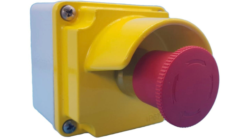Pulsante di arresto di emergenza montaggio superficiale, configurazione 1NC, attuazione a pulsante, rilascio a rotazione, protezione IP66 e IP67, temperatura d'esercizio -25 a +70 gradi, temperatura di conservazione -40 a +85 gradi, dimensioni 108x80x80 mm, colori rosso e giallo, contatti ausiliari NA, serie LPZM. Contenitore in lega di alluminio, collegamento a massa tramite fori filettati.