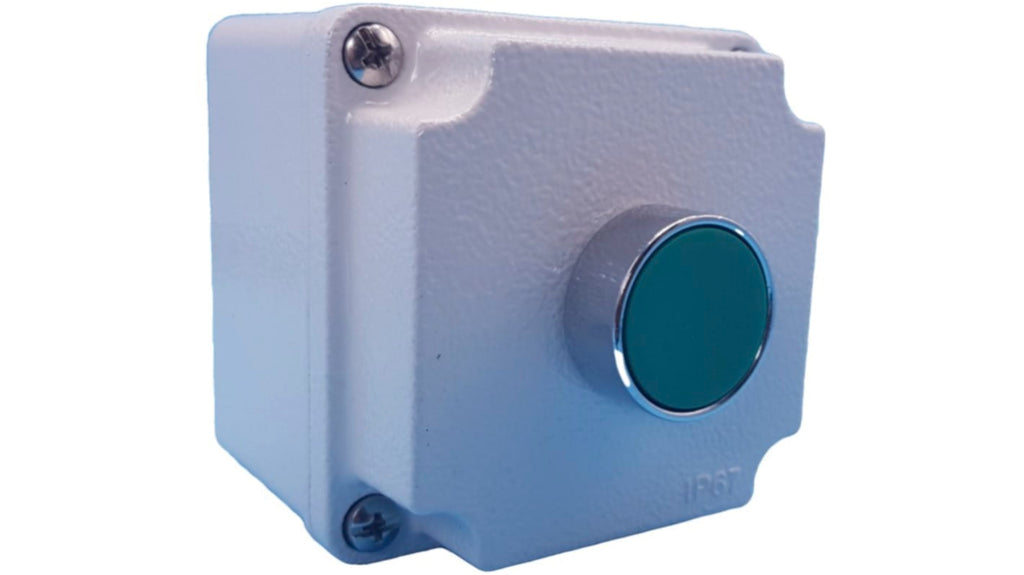 Pulsante di controllo Lovato, IP66, IP67, contenitore in lega di alluminio, attuazione a pulsante Push Push, configurazione contatto SPST, colore verde, diametro foro 22mm, collegamento a massa tramite fori filettati, temperatura d'esercizio -25 a +70 gradi, temperatura di conservazione -40 a +85 gradi, dimensioni 80mm x 73mm x 80mm, tipo terminale a vite.
