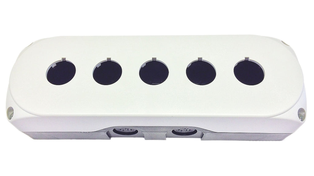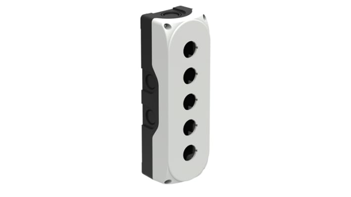 Scatola per pulsante Lovato, stazione di controllo in policarbonato, serie Platinum, 5 fori da 22mm, dimensioni 220 x 72 x 56mm, colore grigio, materiale plastico, protezione IP66, IP67, IP69K, temperatura operativa da -25 a +70 gradi Celsius. Codice costruttore LPZP5A8.