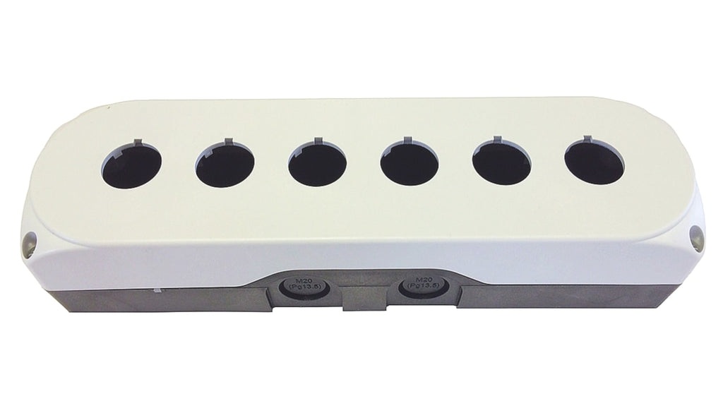 Scatola per pulsante Lovato, stazioni di controllo in policarbonato, diametro foro 22mm, 6 fori, colore grigio, materiale plastica, protezione IP66, IP67, IP69K, massima temperatura operativa +70°C, montaggio in qualunque posizione. Codice costruttore LPZP6A8.