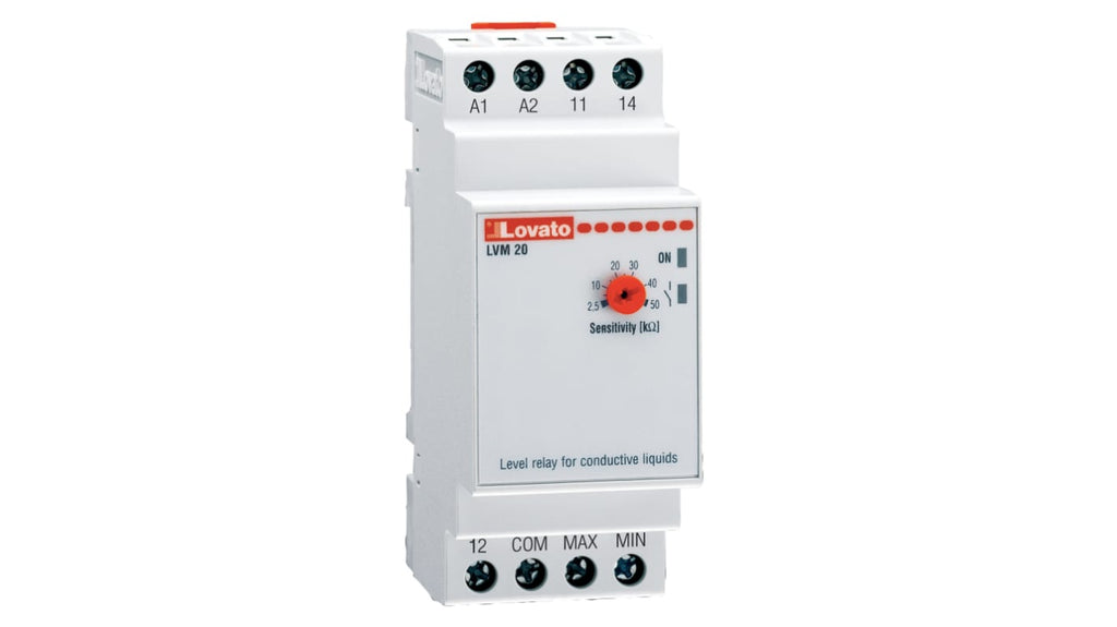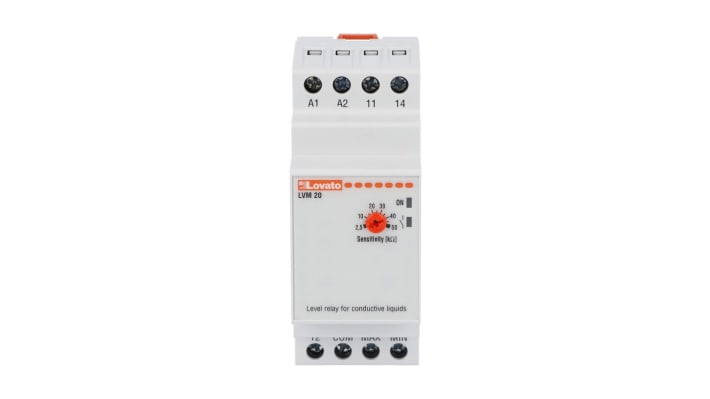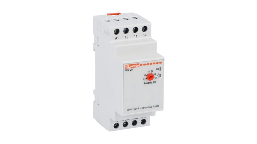 Relè di monitoraggio livello Lovato LVM20A240, configurazione contatto SPDT, sensibilità regolabile 2,5-50 kOhm, temperatura operativa -20°C a +60°C, dimensioni 35,8 x 64,9 x 104,7 mm, alloggiamento modulare DIN 43880, doppio isolamento, indicatori LED di stato, tre elettrodi di rilevamento, certificazioni CSA, UL508, IEC/EN60255-5, grado di protezione IP20 e IP40.