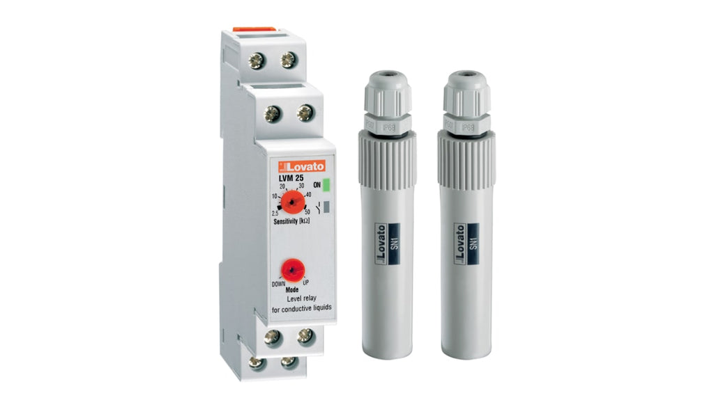 Relè di monitoraggio livello. Sensibilità regolabile da 2,5 kOhm a 50 kOhm, temperatura ambiente da -20 a 60 gradi Celsius, doppio isolamento tra alimentazione, elettrodi e circuito relè, indicatori LED di stato, alloggiamento modulare DIN 43880, 2 moduli, tempo di risposta rapido. Certificazioni CSA, UL508, IEC/EN60255-5, grado di protezione IP20 e IP40. Utilizzato in automazione, ingegneria di controllo dei processi e monitoraggio.