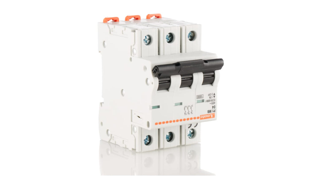 Interruttore magnetotermico Lovato 3P 4A 10 kA, Tipo D, serie P1MB, tensione nominale 230/400 V c.a., capacità di rottura 10 kA, montaggio su guida DIN, dimensioni 86.5 mm x 54 mm x 80 mm, curva di intervento Tipo D, indicatore posizione contatti, disponibile blocchi aggiuntivi.