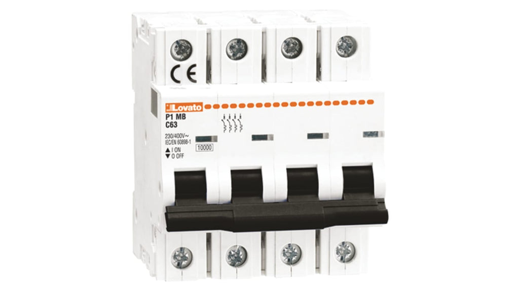 Interruttore magnetotermico Lovato 4P 32A 10 kA, Tipo B, serie P1MB, tensione nominale 230/400 V c.a., capacità di rottura 10 kA, montaggio su guida DIN, dimensioni 86.5 mm x 72 mm x 80 mm, disponibile con blocchi aggiuntivi, curva di intervento Tipo B, valori nominali da 1 a 63 A, tensione di isolamento 440 V, massima tensione di impulso 4 kV.