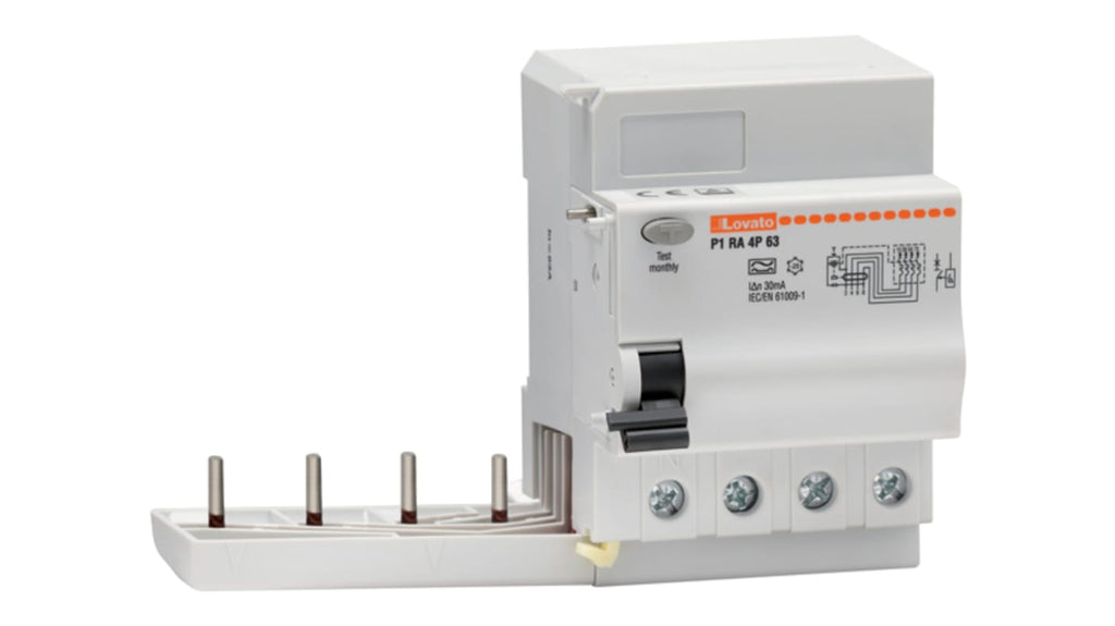 Interruttore magnetotermico Lovato 4P 63A, Tipo A, 4 poli, amperaggio 63A, caratteristica di intervento Tipo A, montaggio guida DIN, serie P1, modello P1RA. Protezione contro il fuoco.
