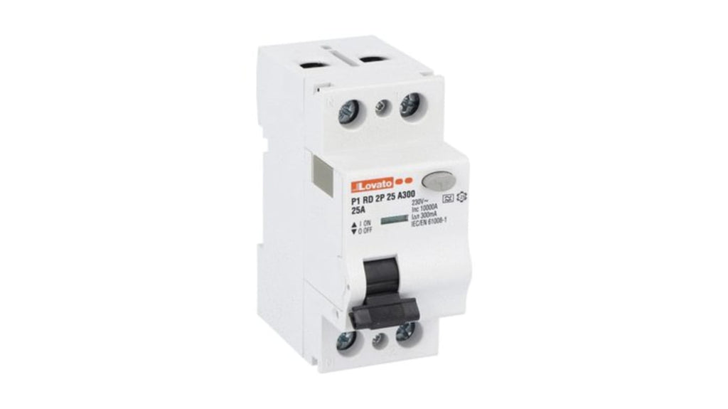 Interruttore automatico a corrente residua Lovato, 2 poli, 25A, sensibilità 300mA, tipo A, tensione nominale 230V ca, azionamento verticale, fissaggio per guida DIN, classe di protezione IP20, grado di inquinamento 2, 10000 cicli di vita elettrica, 20000 cicli di vita meccanica, temperatura d'esercizio -25 °C a +60 °C.
