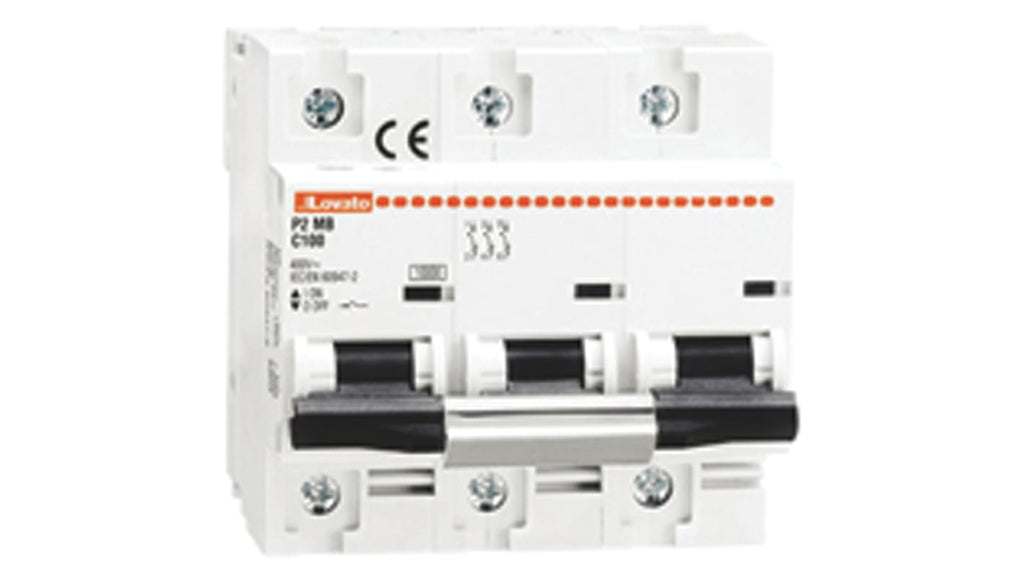 Interruttore magnetotermico Lovato, 3 poli, 100A, curva C, tensione nominale 230/400 V c.a., capacità di rottura 10 kA, montaggio su guida DIN, larghezza 81 mm, lunghezza 85 mm, profondità 80 mm, serie P2MB, indicatore posizione contatti, disponibile in versioni 1P, 2P, 3P e 4P.