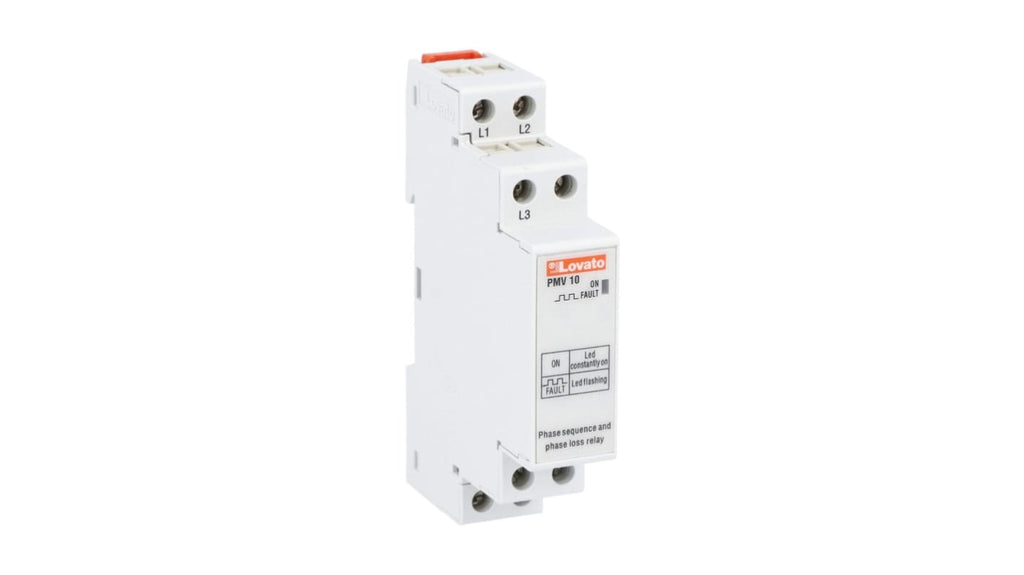 Relè di monitoraggio tensione autoalimentato Lovato, configurazione contatti SPDT, tensione massima rilevata 400 V c.a., montaggio su guida DIN, dimensioni 17,5 x 63 x 104,7 mm, grado di protezione IP40 frontale, IP20 sui terminali, ritardo di 60 ms, temperatura operativa da -20 a +60 gradi Celsius, conforme a IEC/EN 60255-5, IEC/EN 61000-6-2, IEC/EN 61000-6-3, UL 508, CSA C22.2 n. 14.