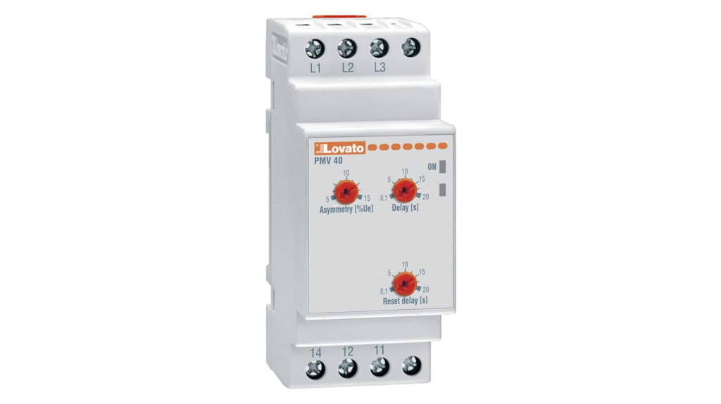 Relè di monitoraggio tensione autoalimentato Lovato, serie PMV40, SPDT. Tensione nominale configurabile, massimo 400V ca, monofase o trifase. Contenitore modulare DIN 43880, dimensioni 35.8 x 64.9 x 104.7 mm. Grado di protezione IP40 frontale, IP20 sui terminali. Ritardo 0.1 a 20 s, temperatura operativa da -20 a +60 gradi Celsius. Conformità a norme IEC/EN 60255-5, UL 508, CSA C22.2 n. 14.